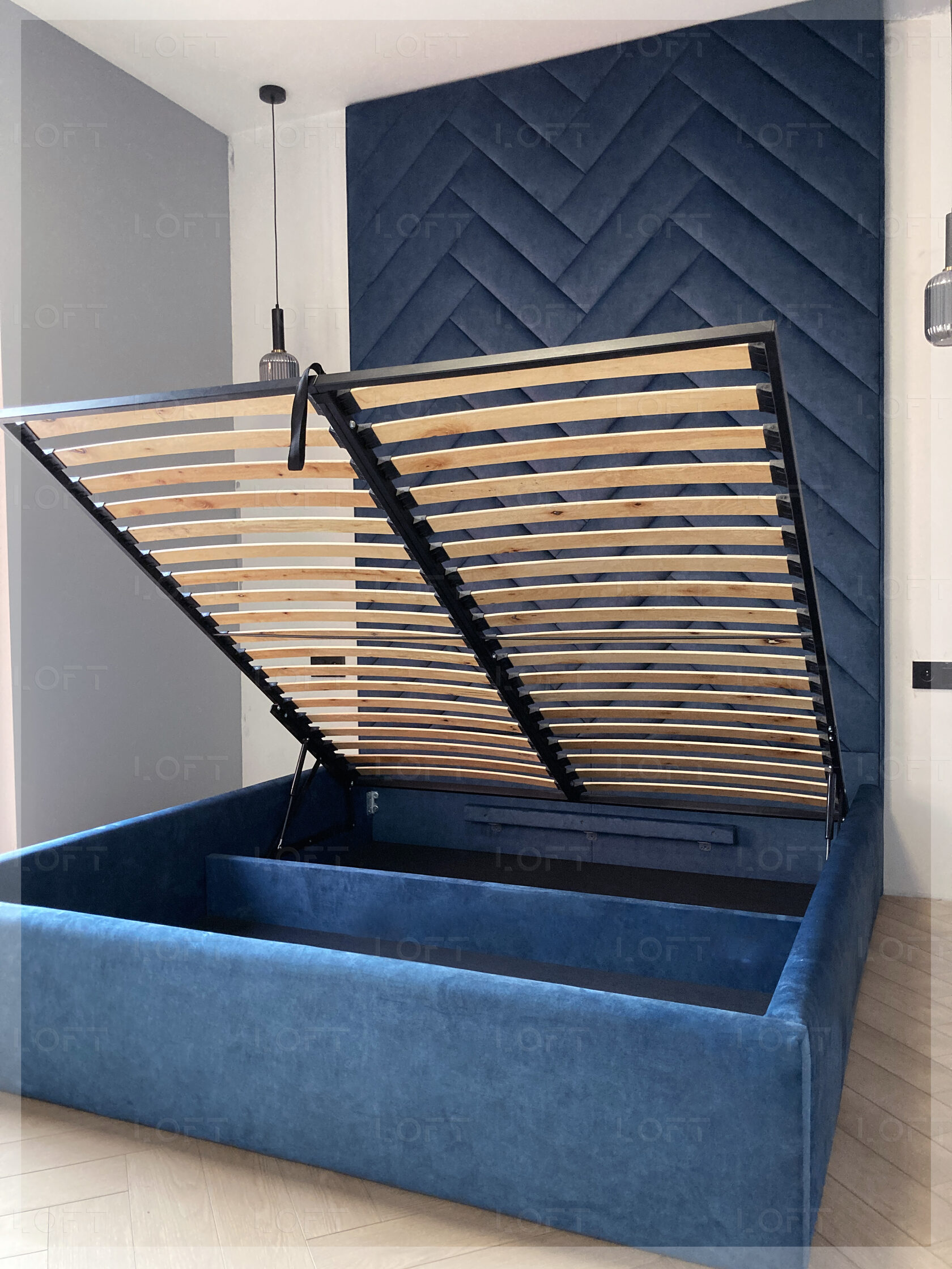 Ściana tapicerowana (panele tapicerowane) Aleksandria z łóżkiem charakteryzuje się zagłówkiem 3D przepikowanym w niezwykle modny wzór jodełki. Zaletą łóżka jest jego funkcjonalność. Łóżko zawiera solidny stelaż na ramie metalowej wraz z pojemnikiem na pościel.