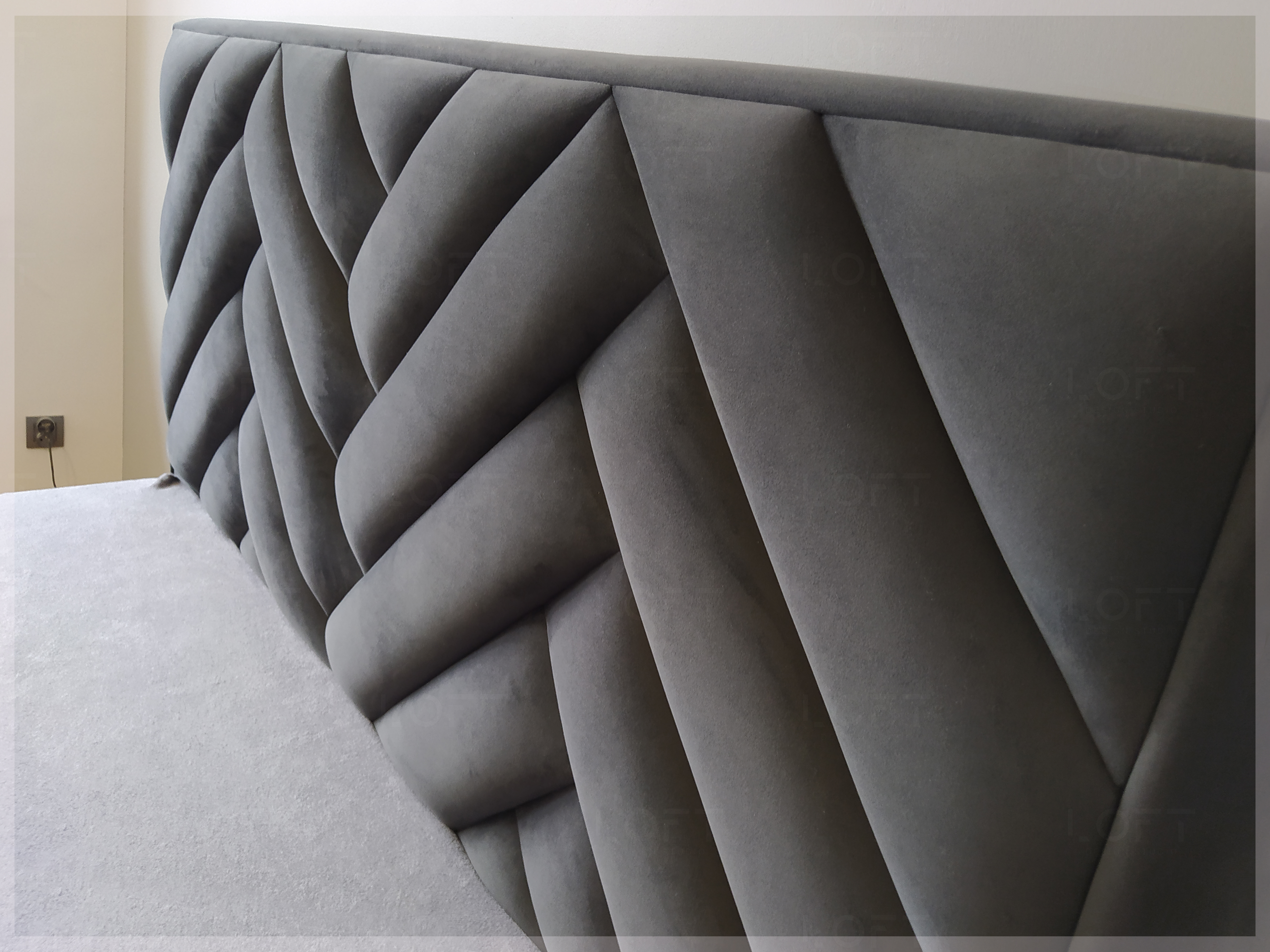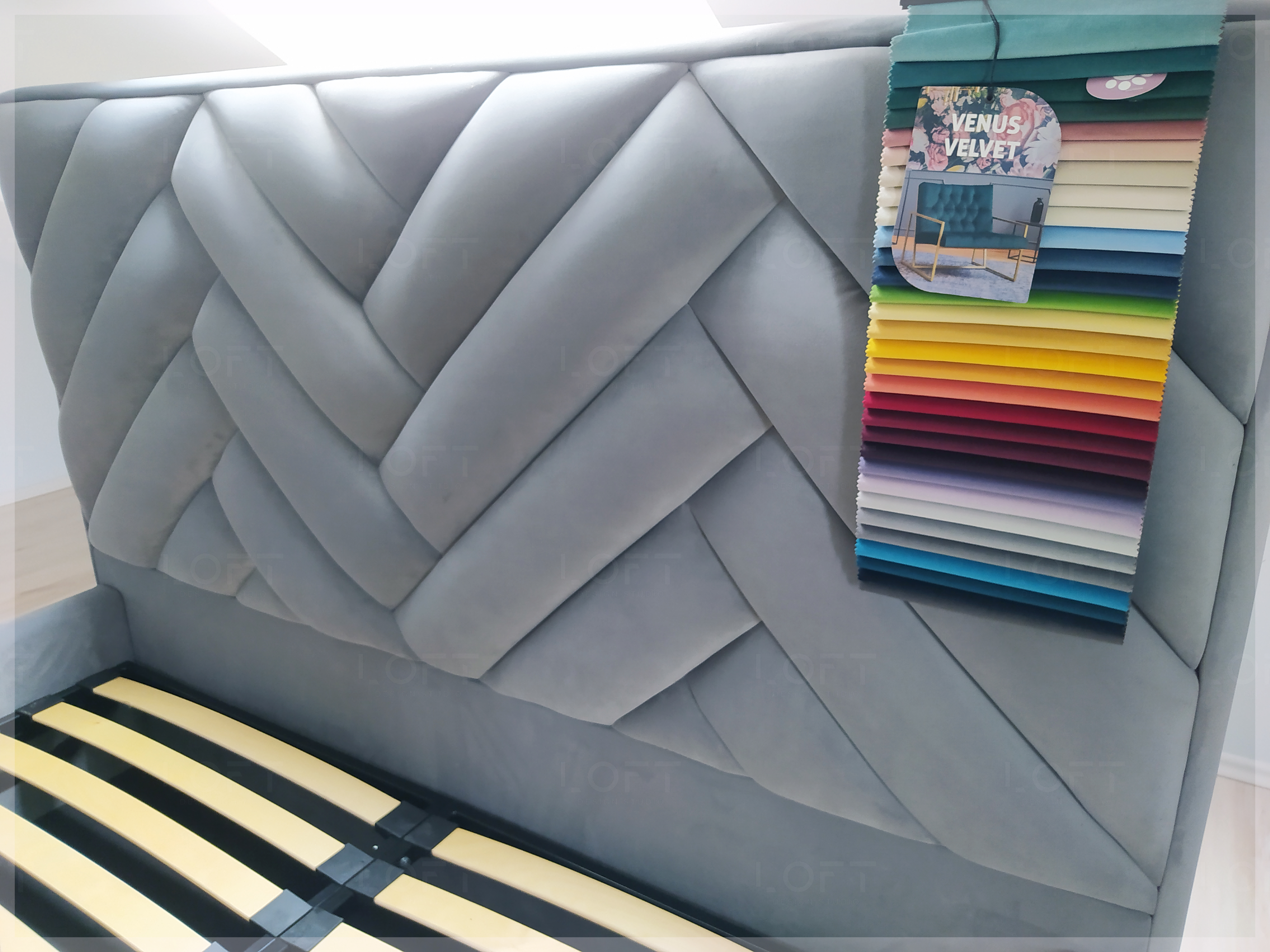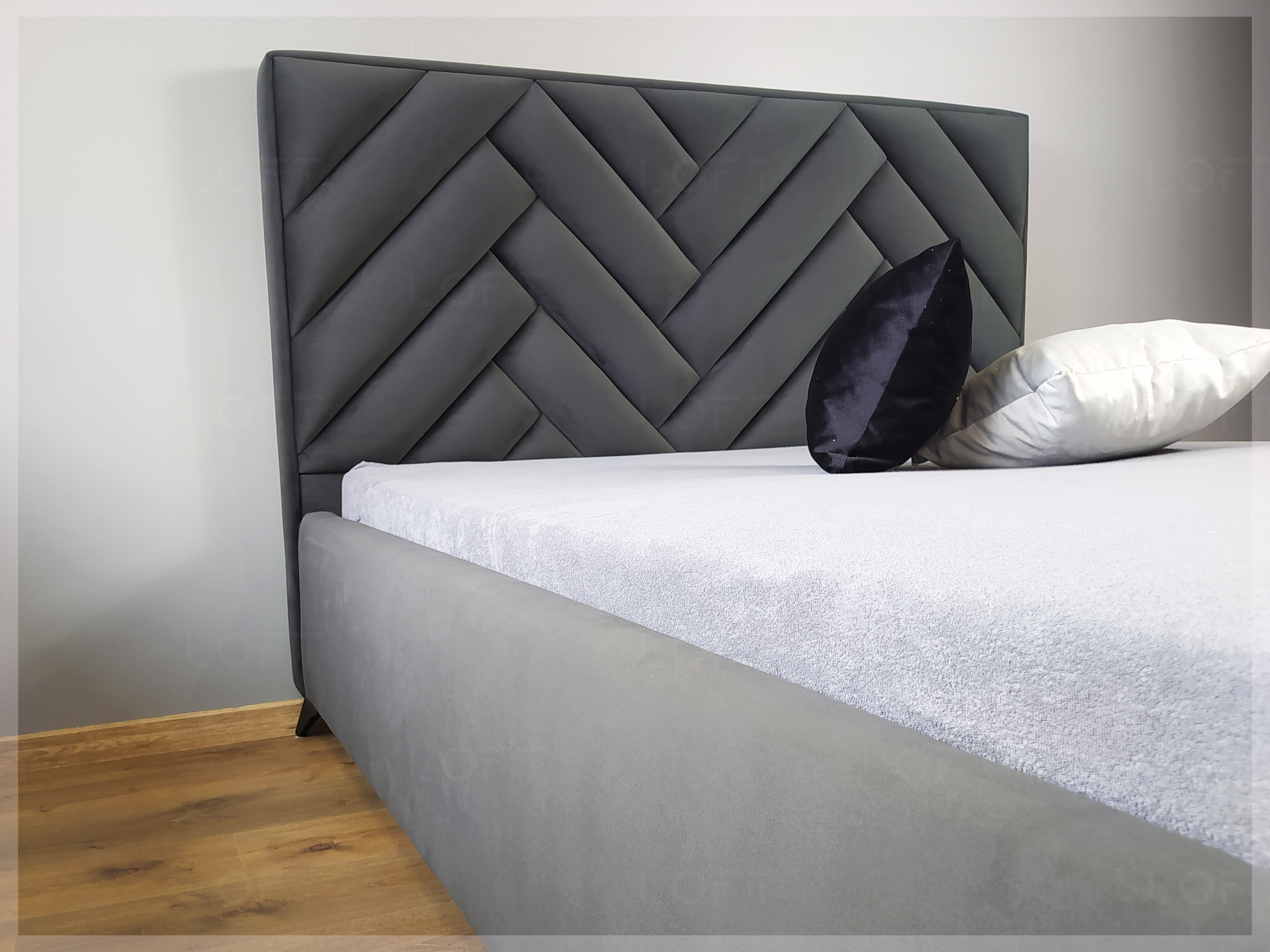 To łóżko tapicerowane Aleksandria charakteryzuje się zagłówkiem 3D przepikowanym w niezwykle modny wzór jodełki.