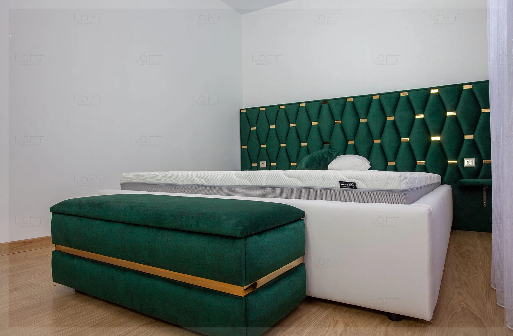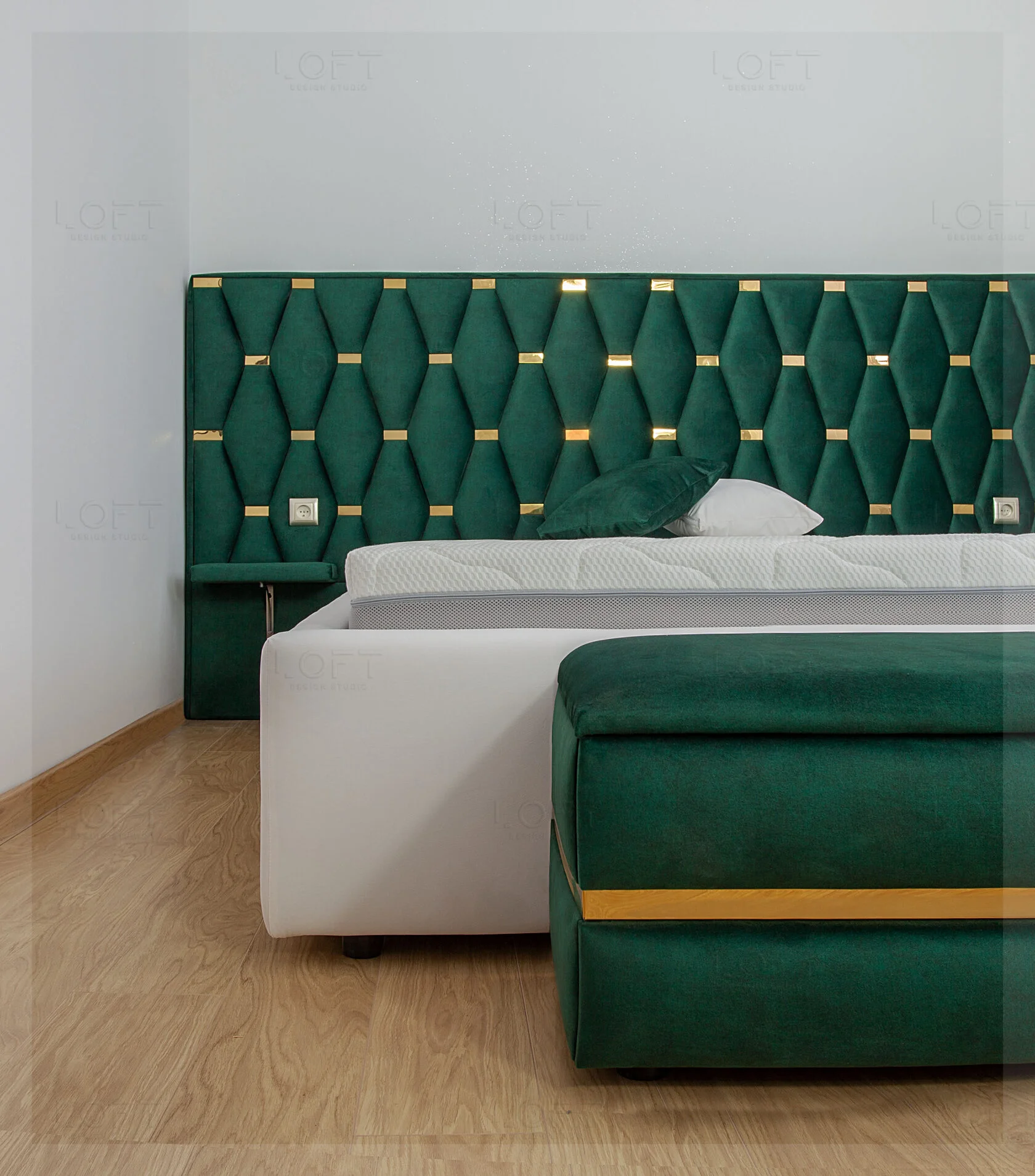 Ściana tapicerowana Amsterdam z łóżkiem to luksusowy zestaw mebli tapicerowanych pokazany w tkaninie ze złotym lakierowanym wykończeniem. Dostępne opcje wykończeń: stal lakierowana w kolorze złotym, brązowym, srebrnym, czarnym. Łóżko jest dostępne w różnych rozmiarach. Ta luksusowa nowoczesna kolekcja łączy w sobie wyjątkowość z nowoczesnym stylem. Oferujemy kompletny wygląd z możliwością dostosowania w każdym szczególe. Do wyboru szeroki wybór tkanin (próbki dostępne na życzenie).