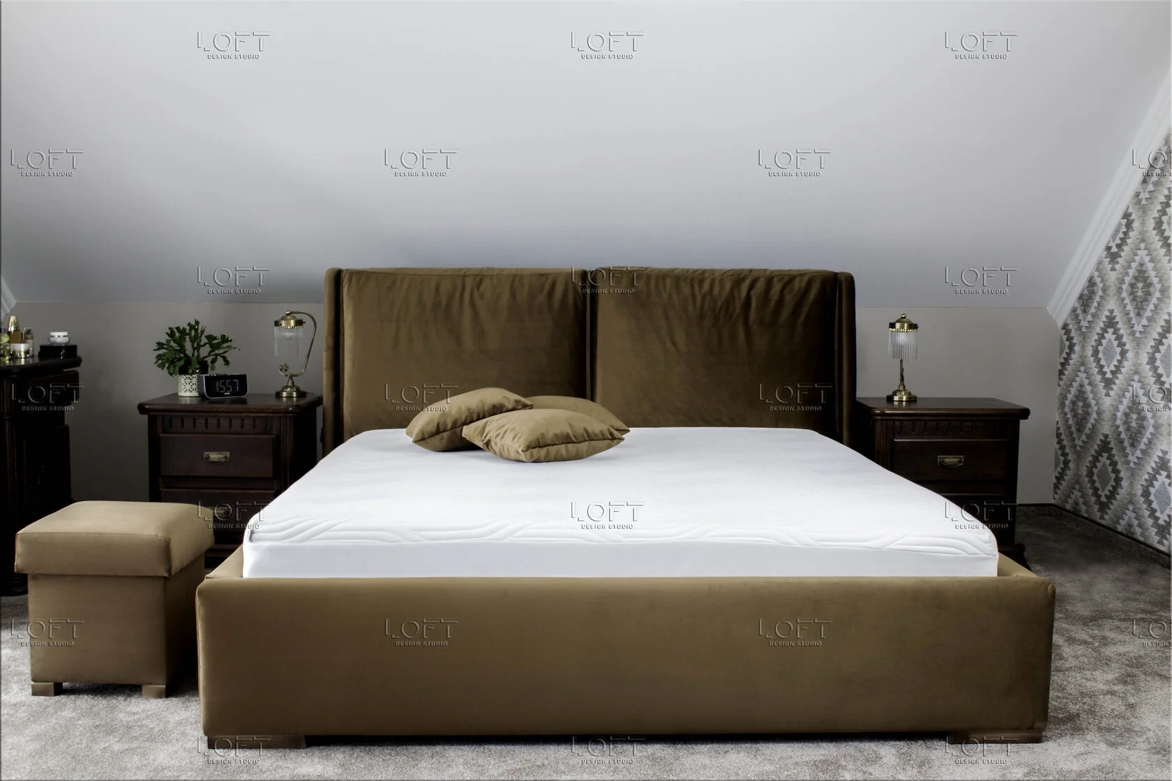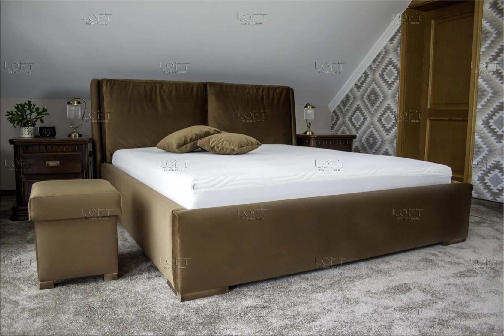 • z zagłówkiem standardowym albo ze ścianą tapicerowaną na wysokość lub szerokość pokoju