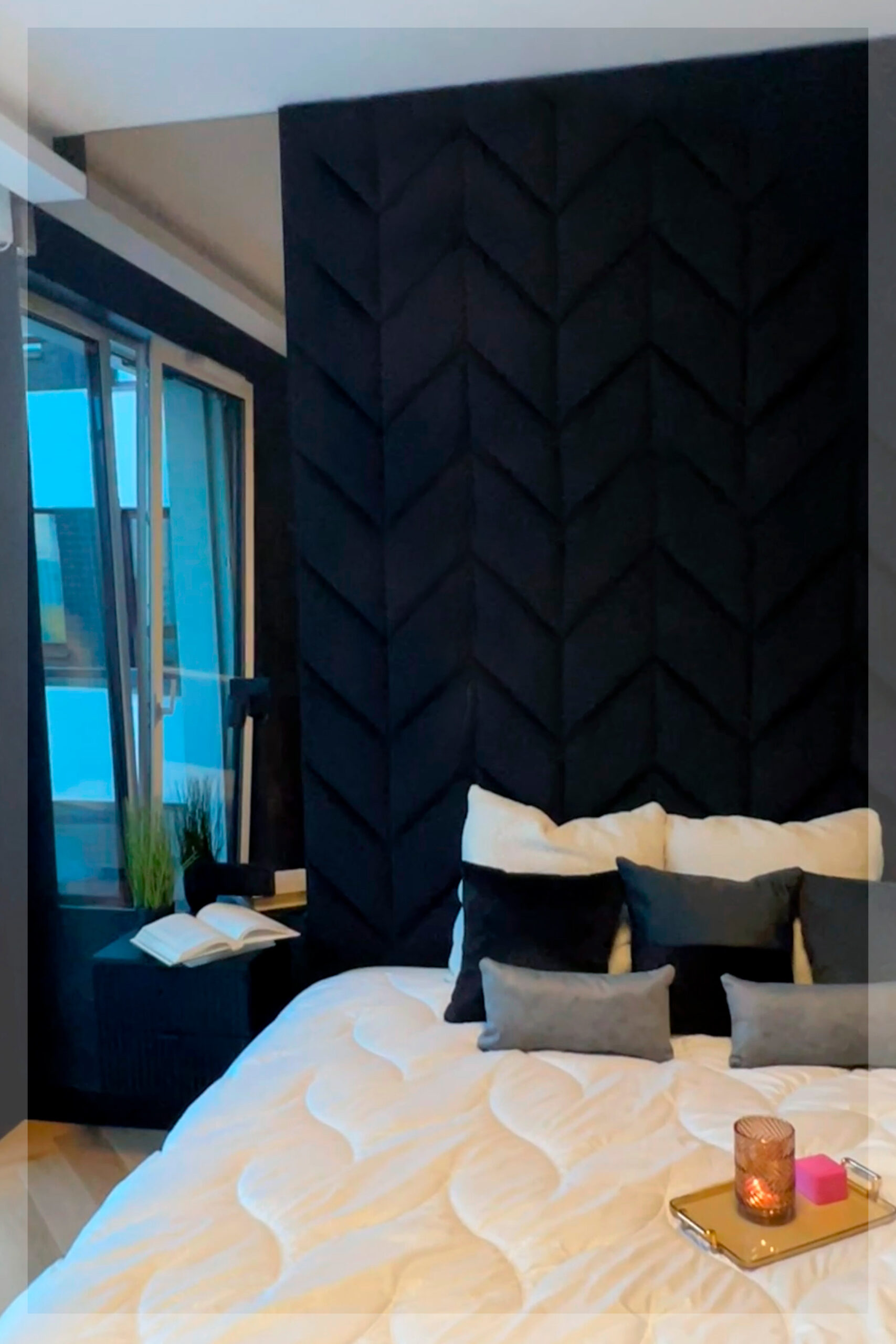 Ściana tapicerowana (panele tapicerowane) Brazil z łóżkiem charakteryzuje się zagłówkiem 3D przepikowanym w niezwykle modny wzór jodełki. Ta luksusowa nowoczesna kolekcja łączy w sobie wyjątkowość z nowoczesnym stylem. Zaletą łóżka jest jego funkcjonalność. Łóżko zawiera solidny stelaż na ramie metalowej wraz z pojemnikiem na pościel.