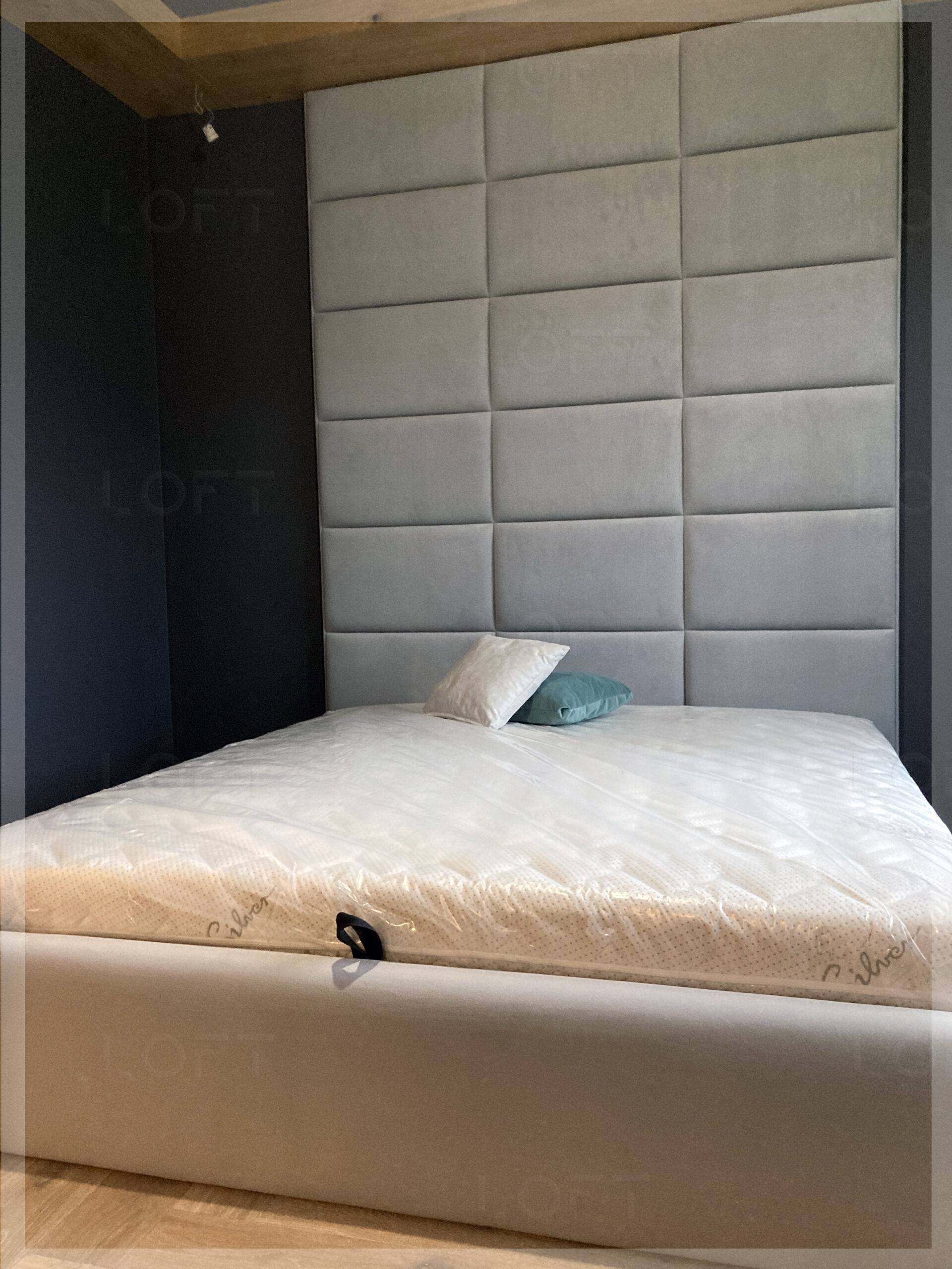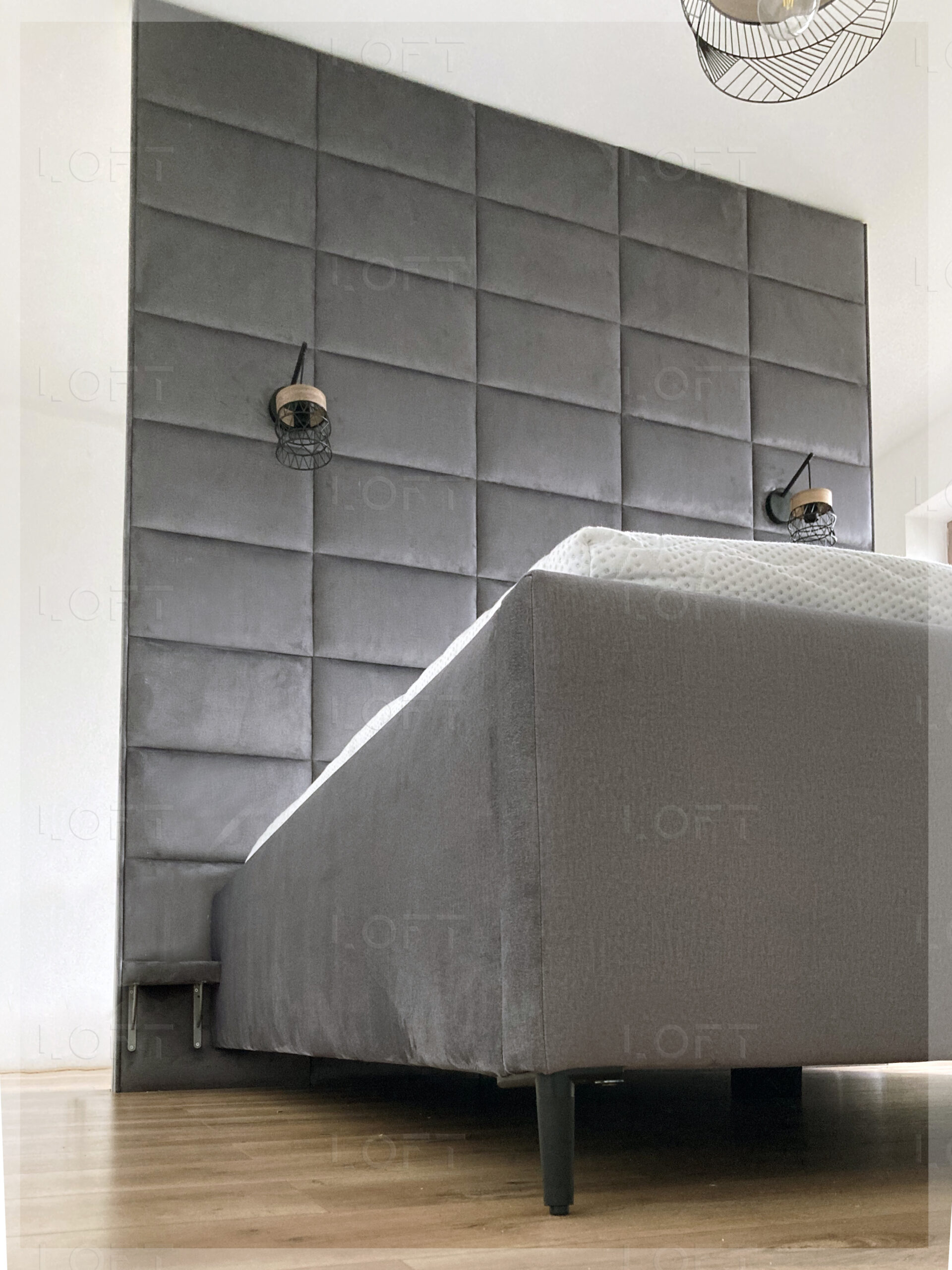 Łóżko ze ścianą tapicerowaną Dallas to elegancki minimalizm zawarty w prostej formie. Wysokie tapicerowane wezgłowie do sufitu sprawia, że łóżko staje się głównym i stylowym elementem sypialni. Prostokątne kasetony w kształcie Czekolady dodają łóżku prosty elegancki styl. Łóżko posiada duży pojemnik na pościel, otwierany na podnośnikach gazowych do góry, dzięki czemu zyskujemy pojemny schowek.
