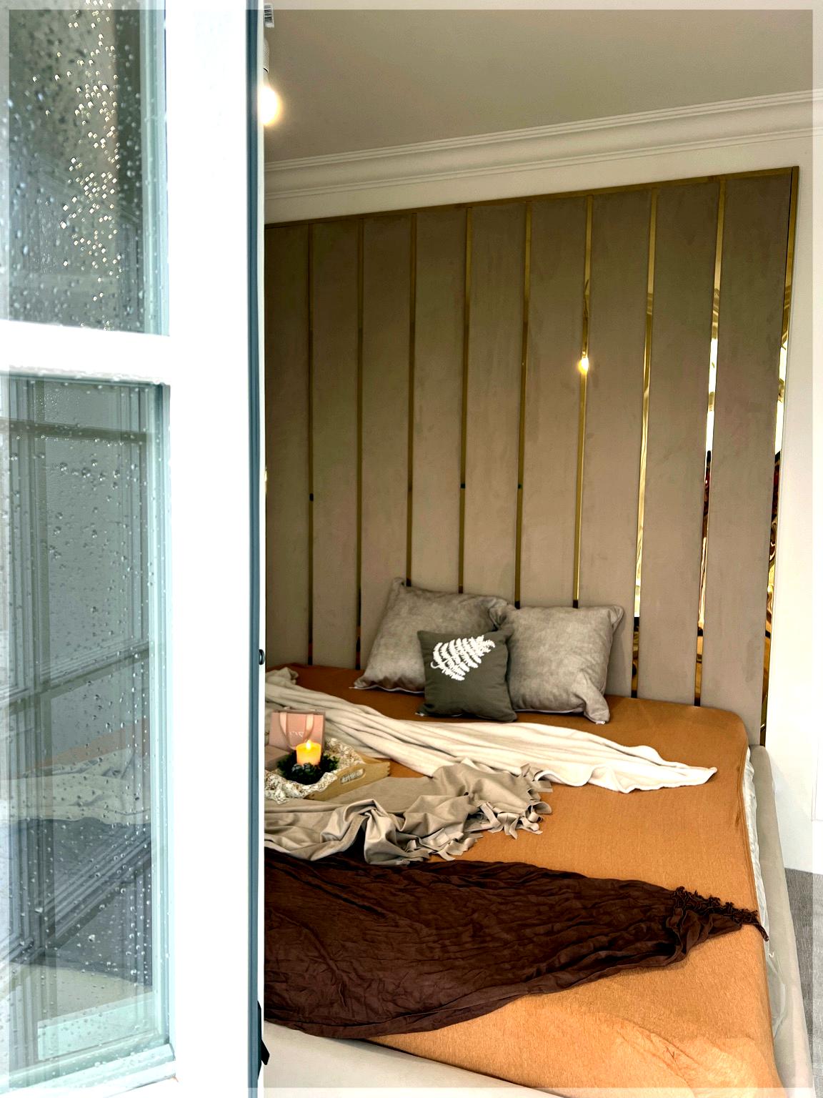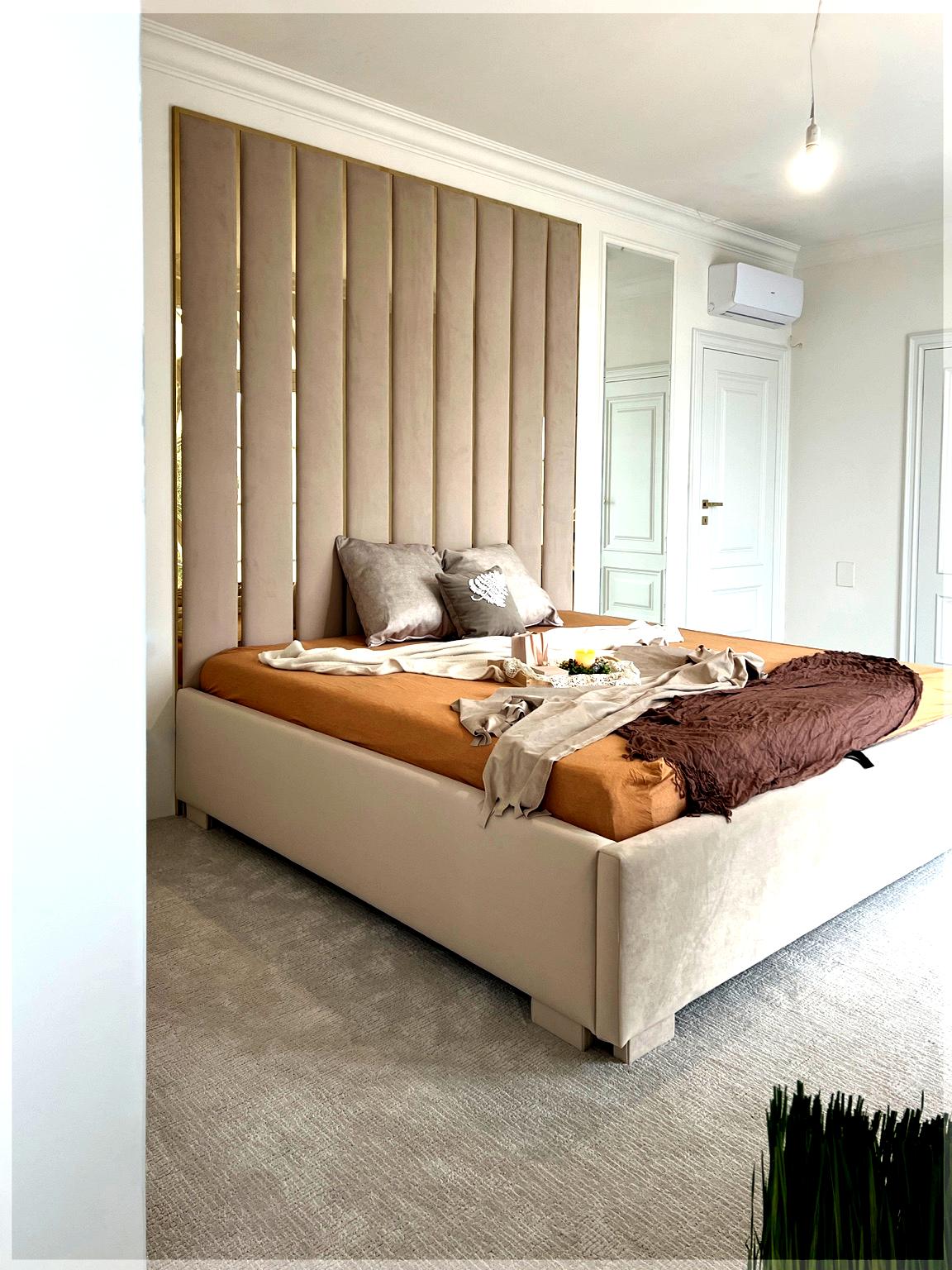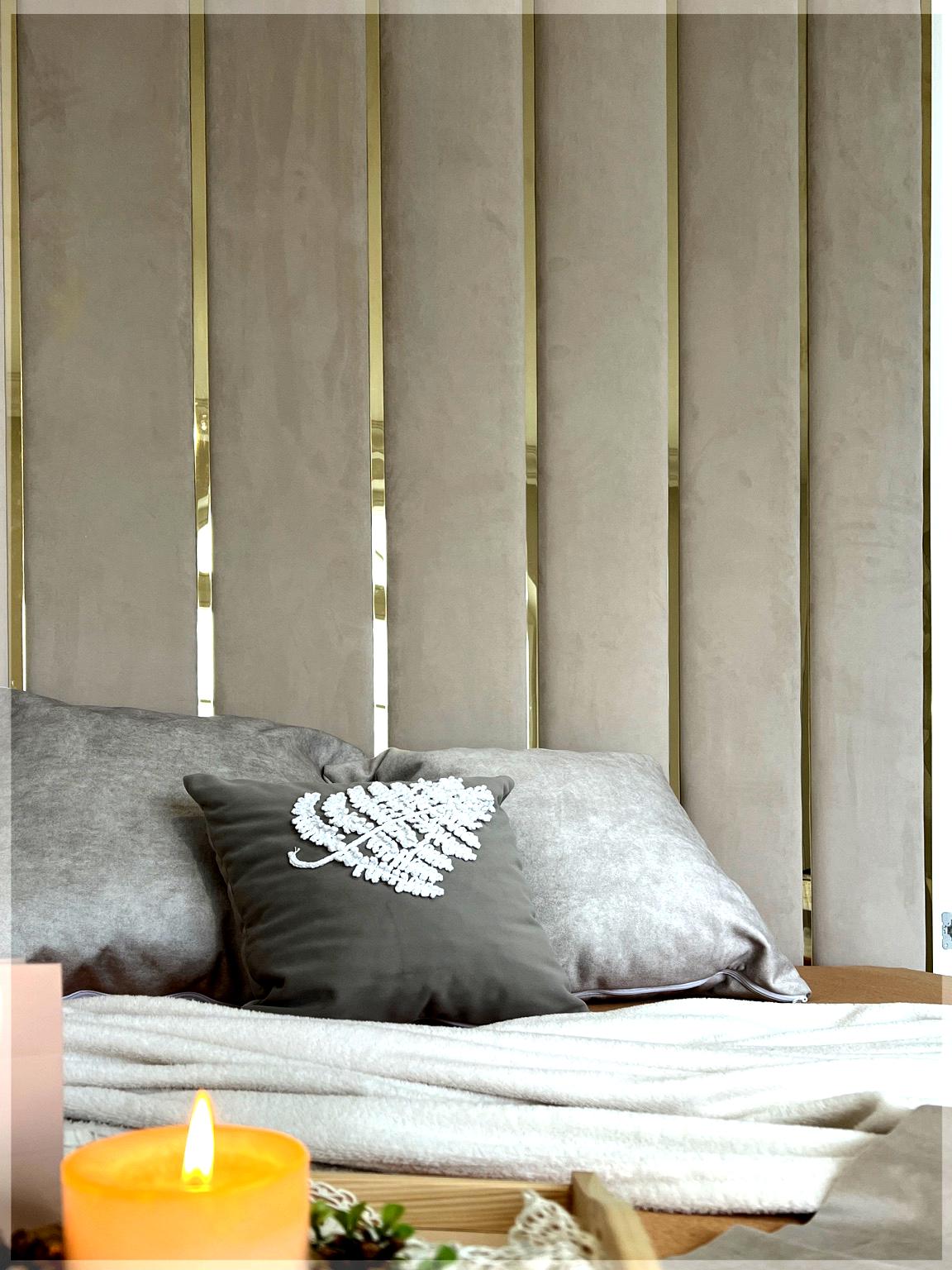 Panele tapicerowane Detroit PLUS z łóżkiem to elegancki minimalizm zawarty w prostej formie. Wysokie do sufitu albo na szerokość pokoju, tapicerowane wezgłowie sprawia, że łóżko staje się głównym i stylowym elementem sypialni. Pionowe kasetony z listwami metalowymi w różnych kolorach dodają łóżku prosty elegancki styl. Łóżko zawiera solidny stelaż na ramie metalowej wraz z pojemnikiem na pościel.