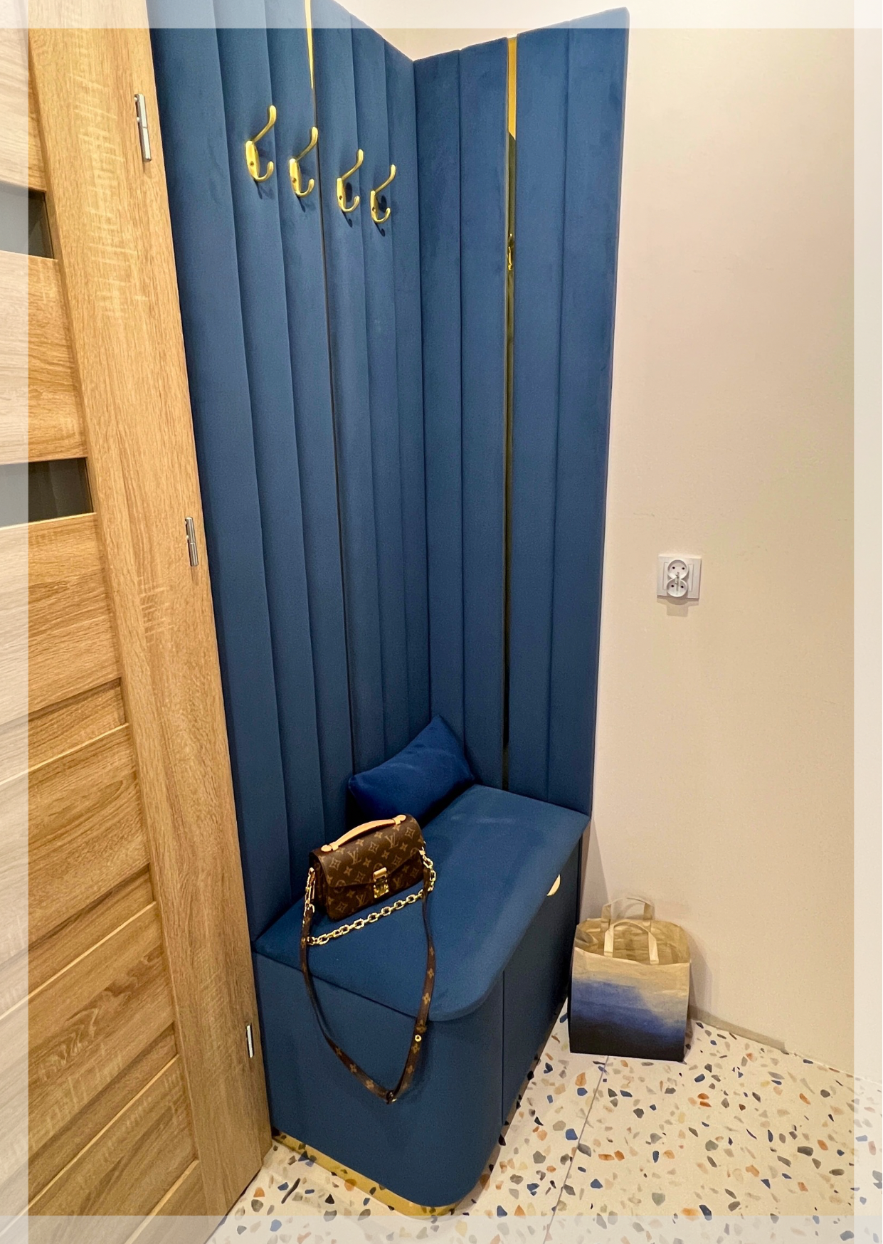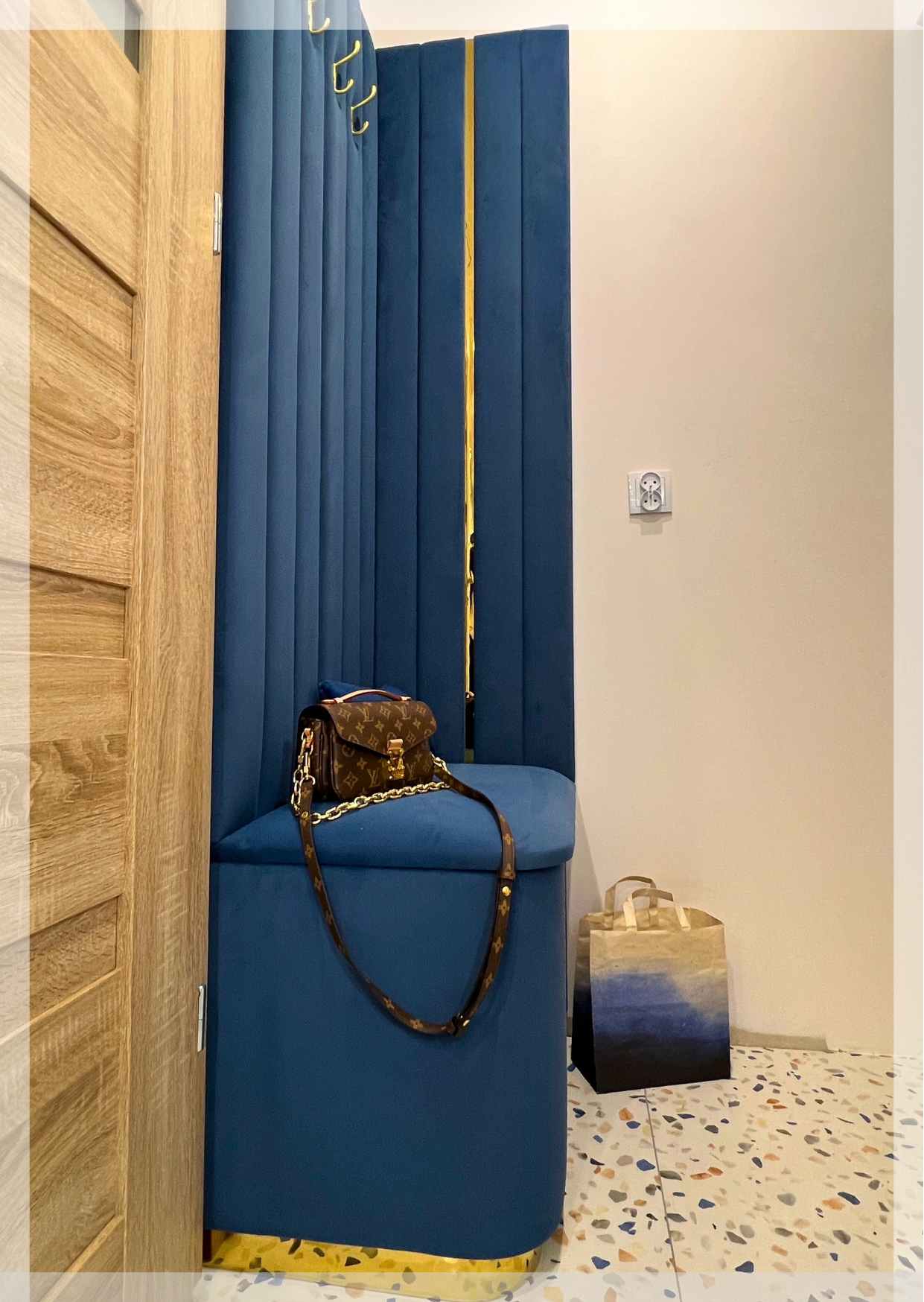 Przedpokój tapicerowany to idealny sposób na przełamanie wnętrzarskiej rutyny. Wnęka Lagos pokazana w tapicerowanej tkaninie ze złotym lakierowanym wykończeniem. Dostępne opcje wykończeń: stal lakierowana w kolorze złotym, brązowym, srebrnym, czarnym.