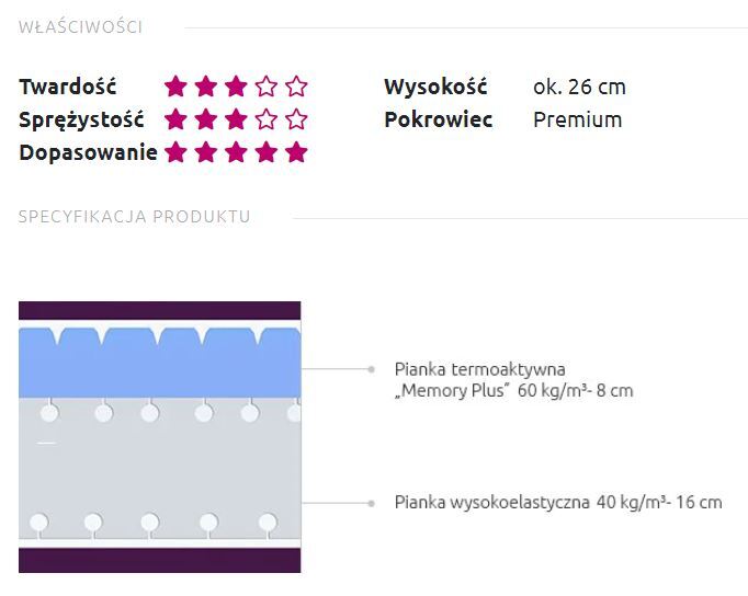 Materac 5-strefowy, którego podstawę stanowi pianka wysokoelastyczna, połączona z warstwą pianki MEMORY PLUS. Solidny rdzeń z pianki wysokoelastycznej zapewnia wysoką trwałość i elastyczność materaca Sensive. Zastosowanie pianki termoelastyczej o zwiększonej gęstości i grubości sprawia, że jest to model wyjątkowo komfortowy, który cechuje wysoki stopień dopasowania dzięki czemu będzie się świetnie sprawdzał w każdej sypialni.