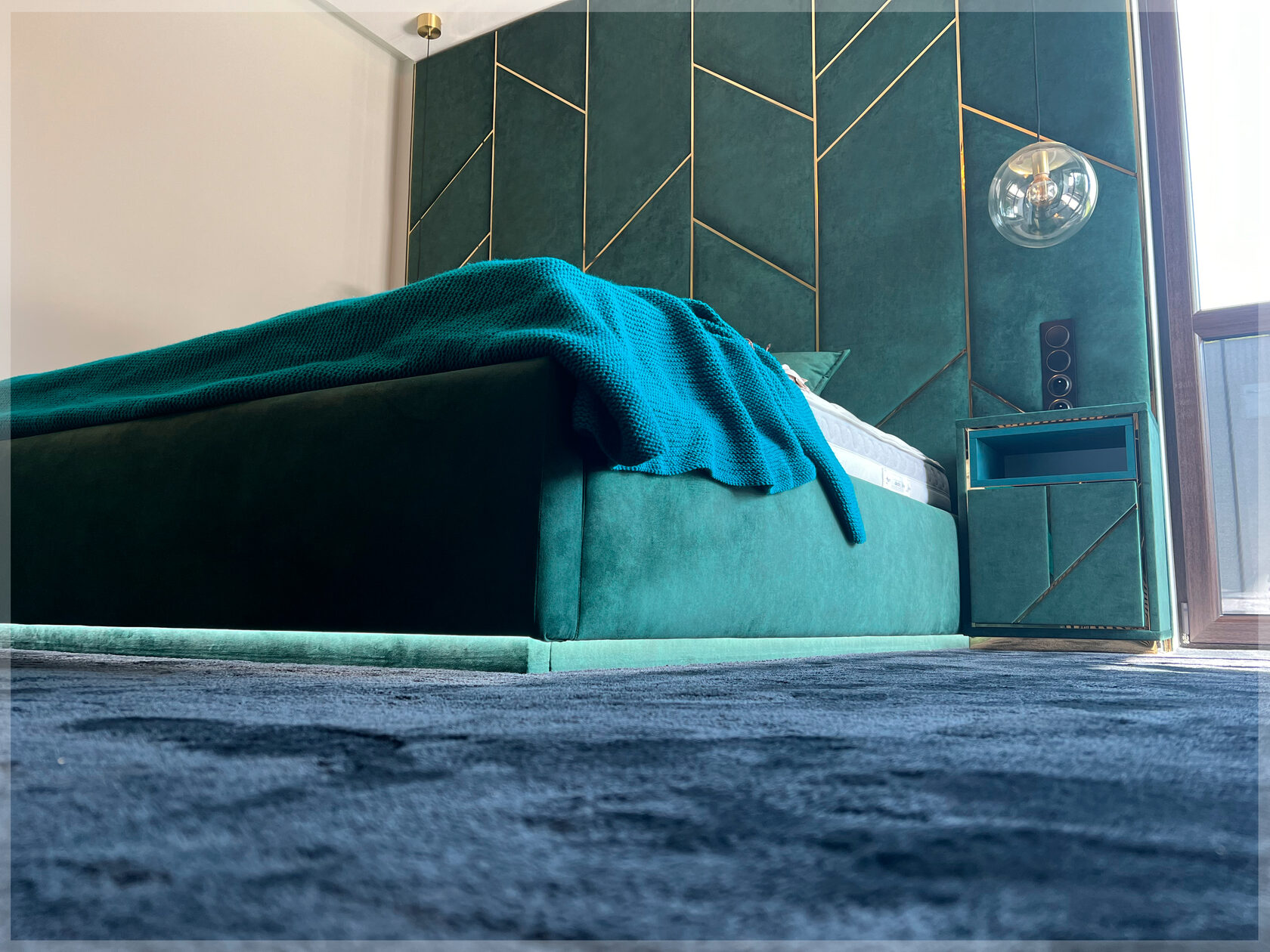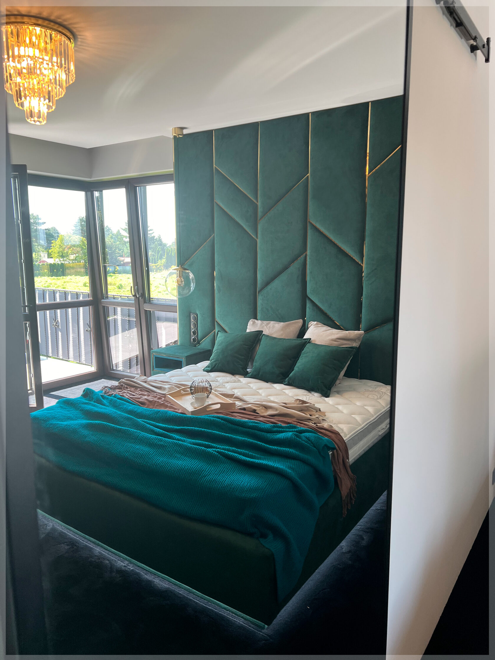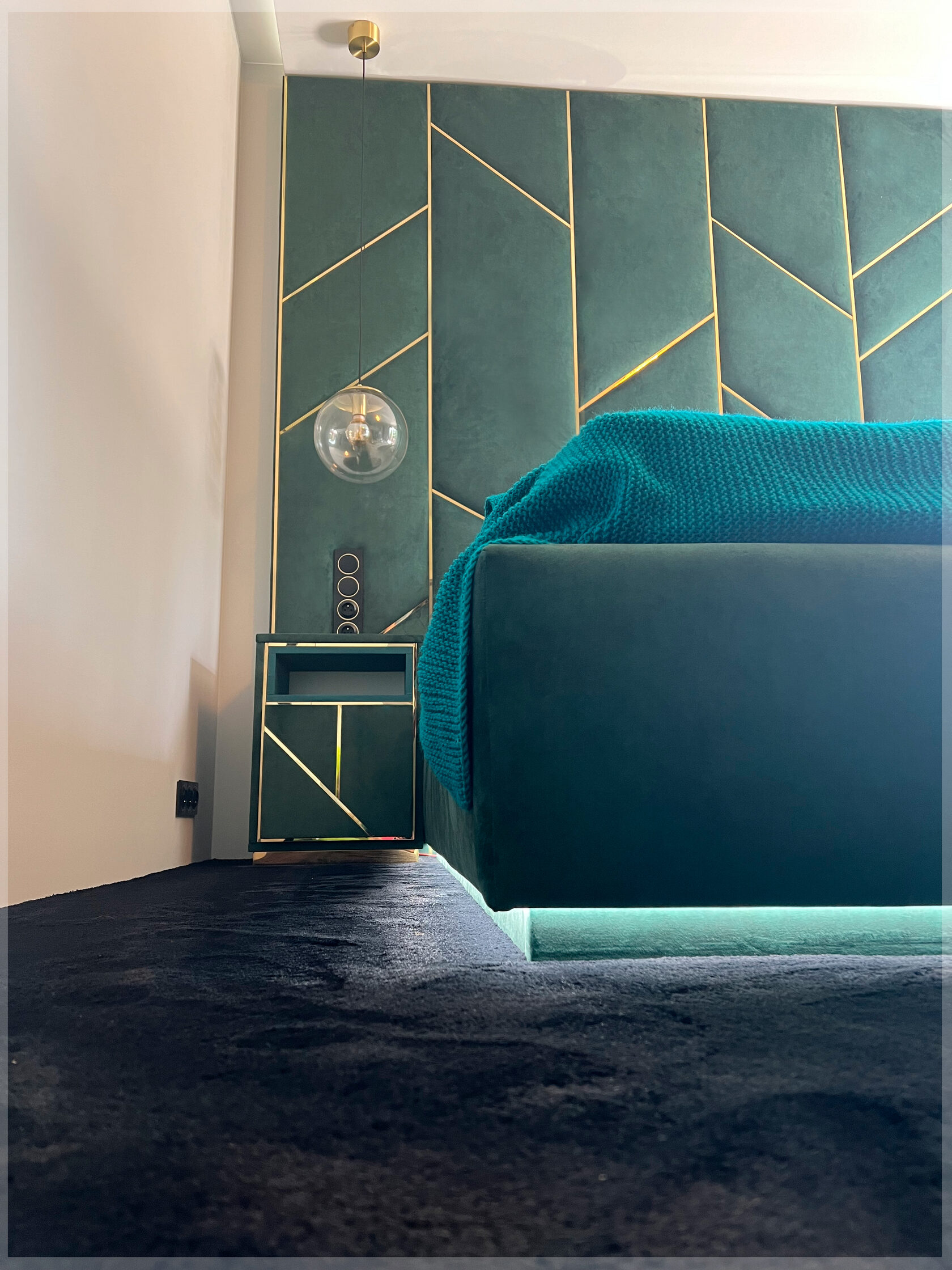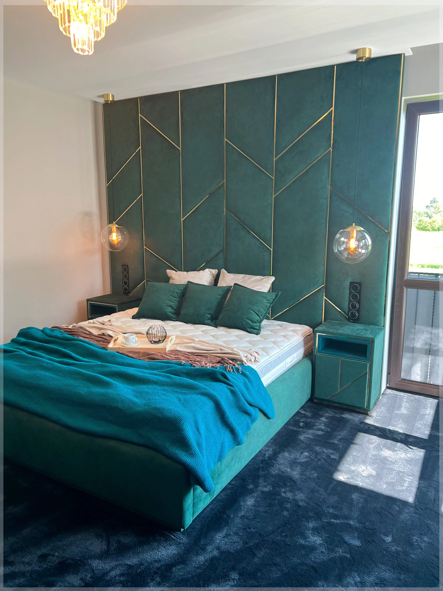 - z zagłówkiem standardowym albo ze ścianą tapicerowaną na wysokość lub szerokość pokoju