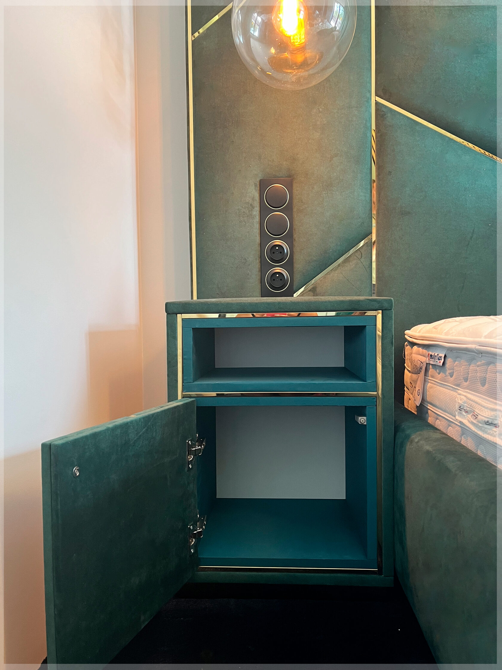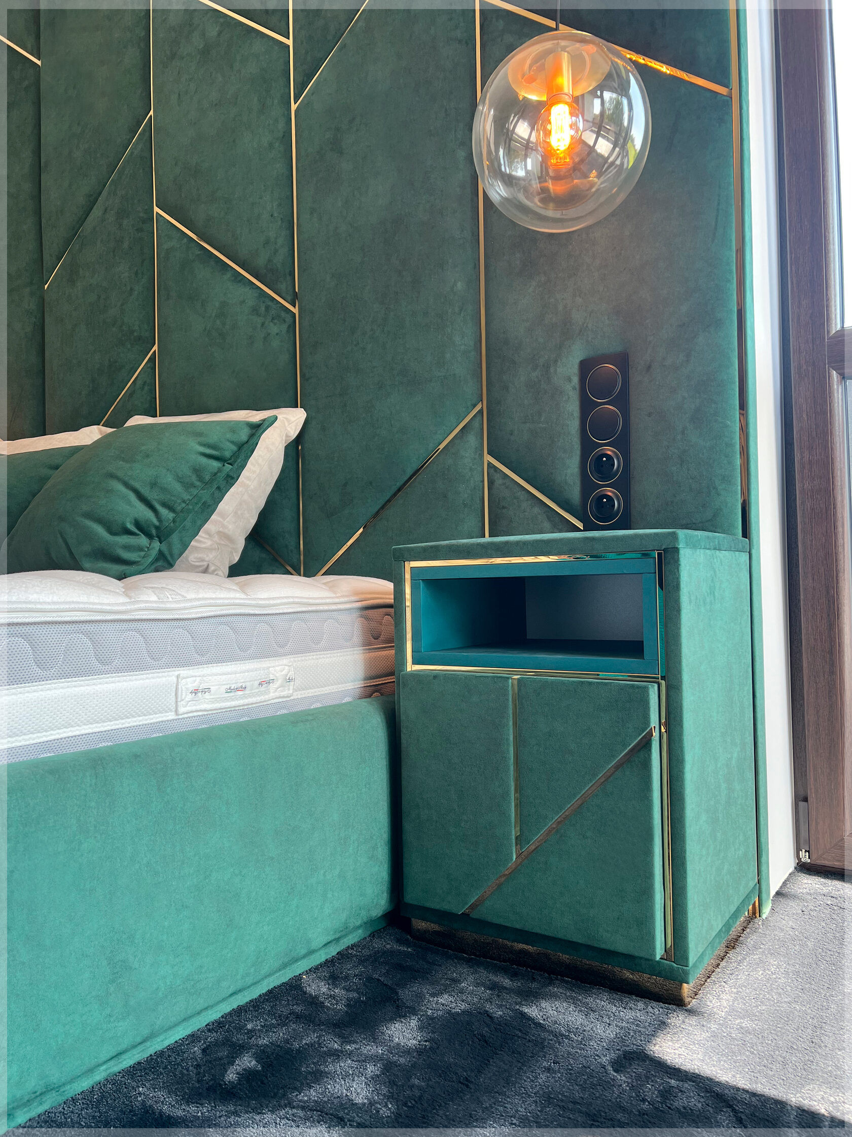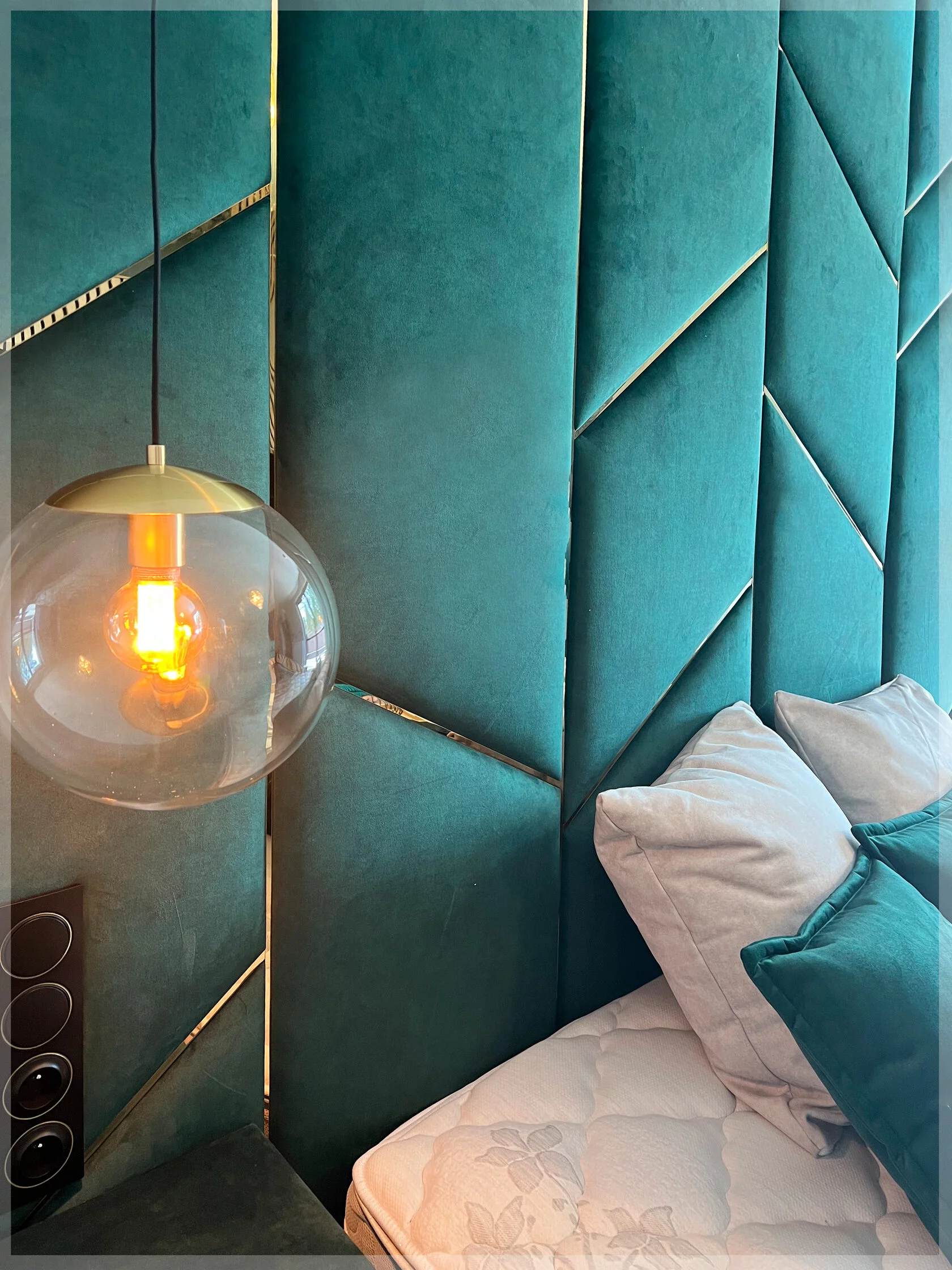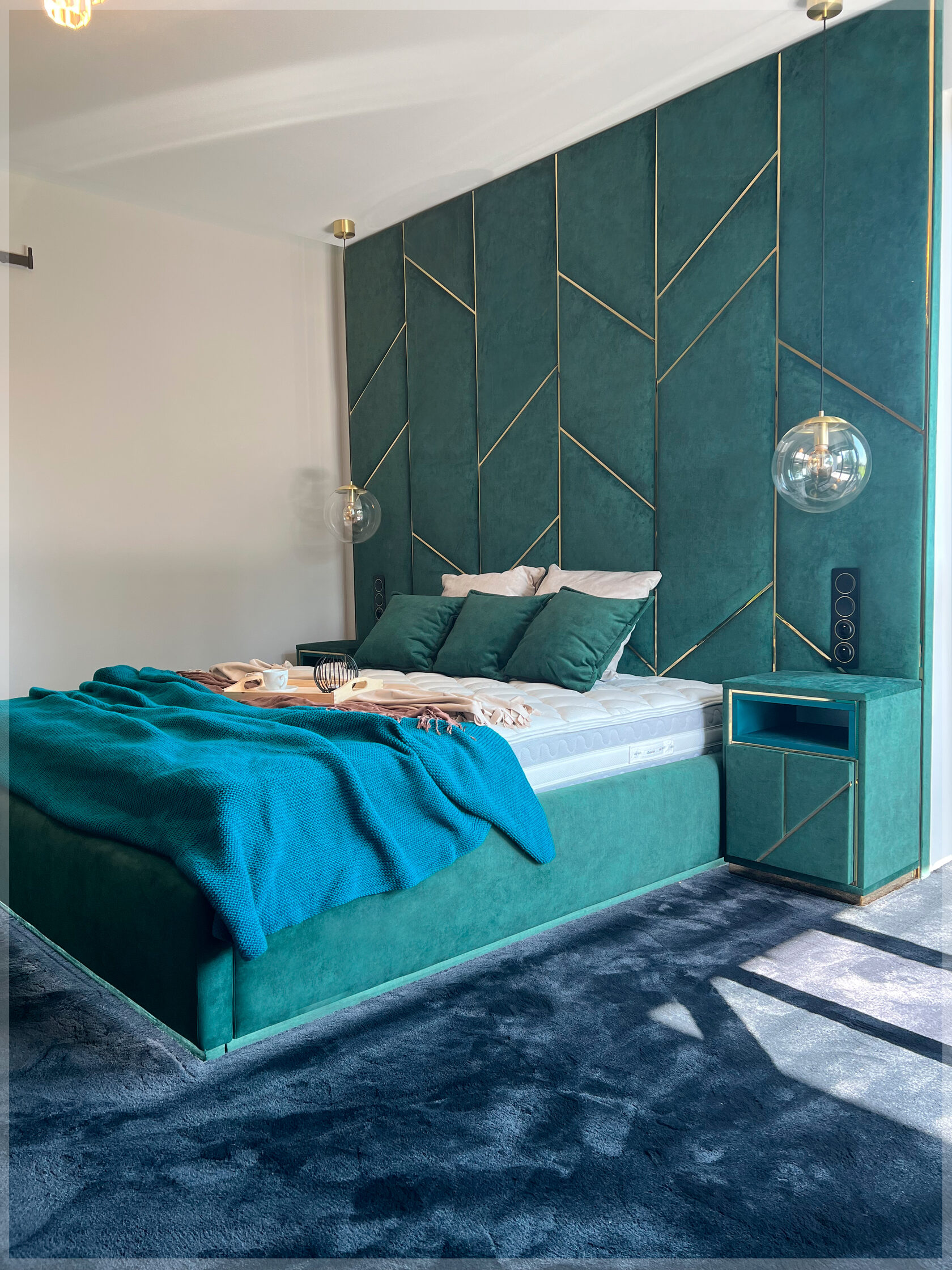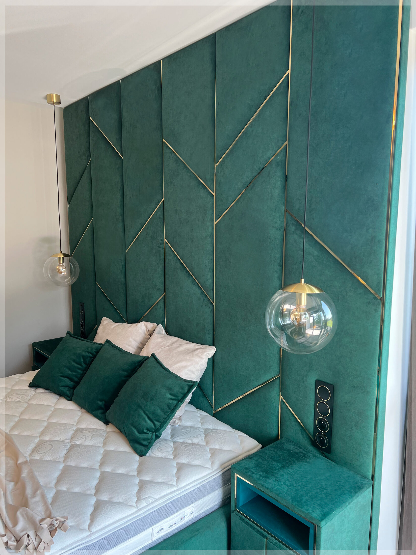 - z zagłówkiem standardowym albo ze ścianą tapicerowaną na wysokość lub szerokość pokoju