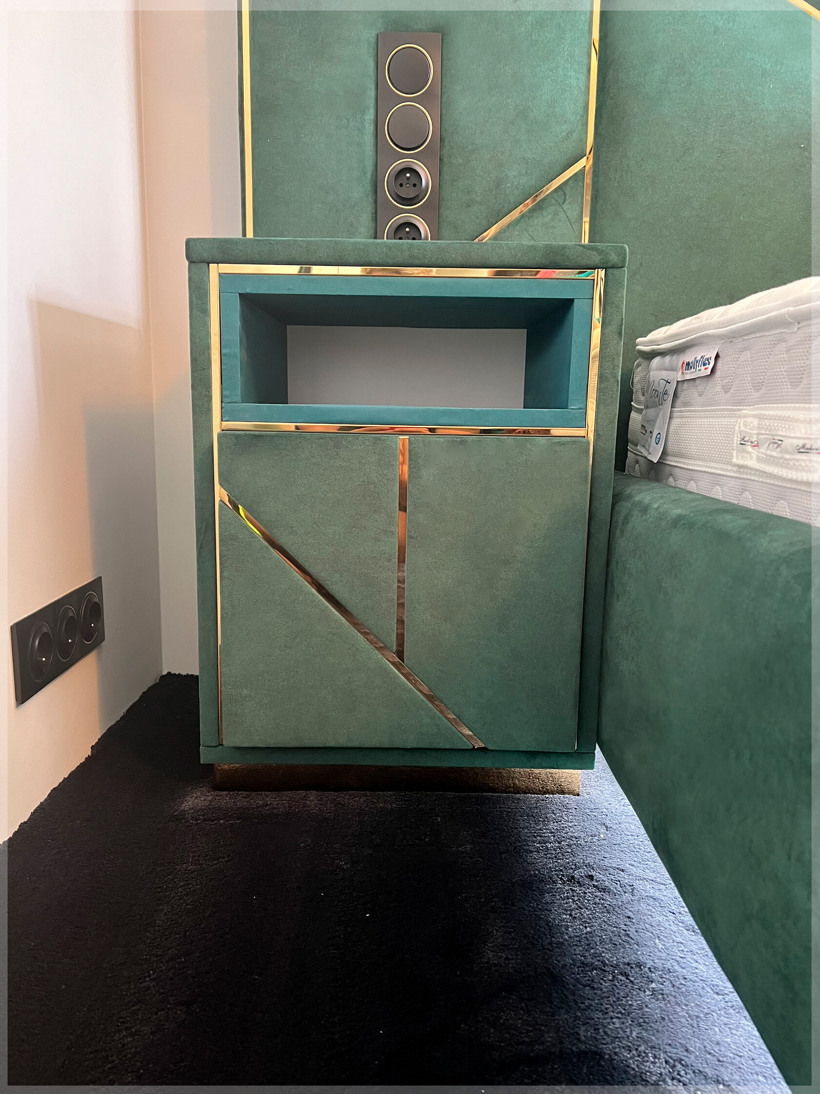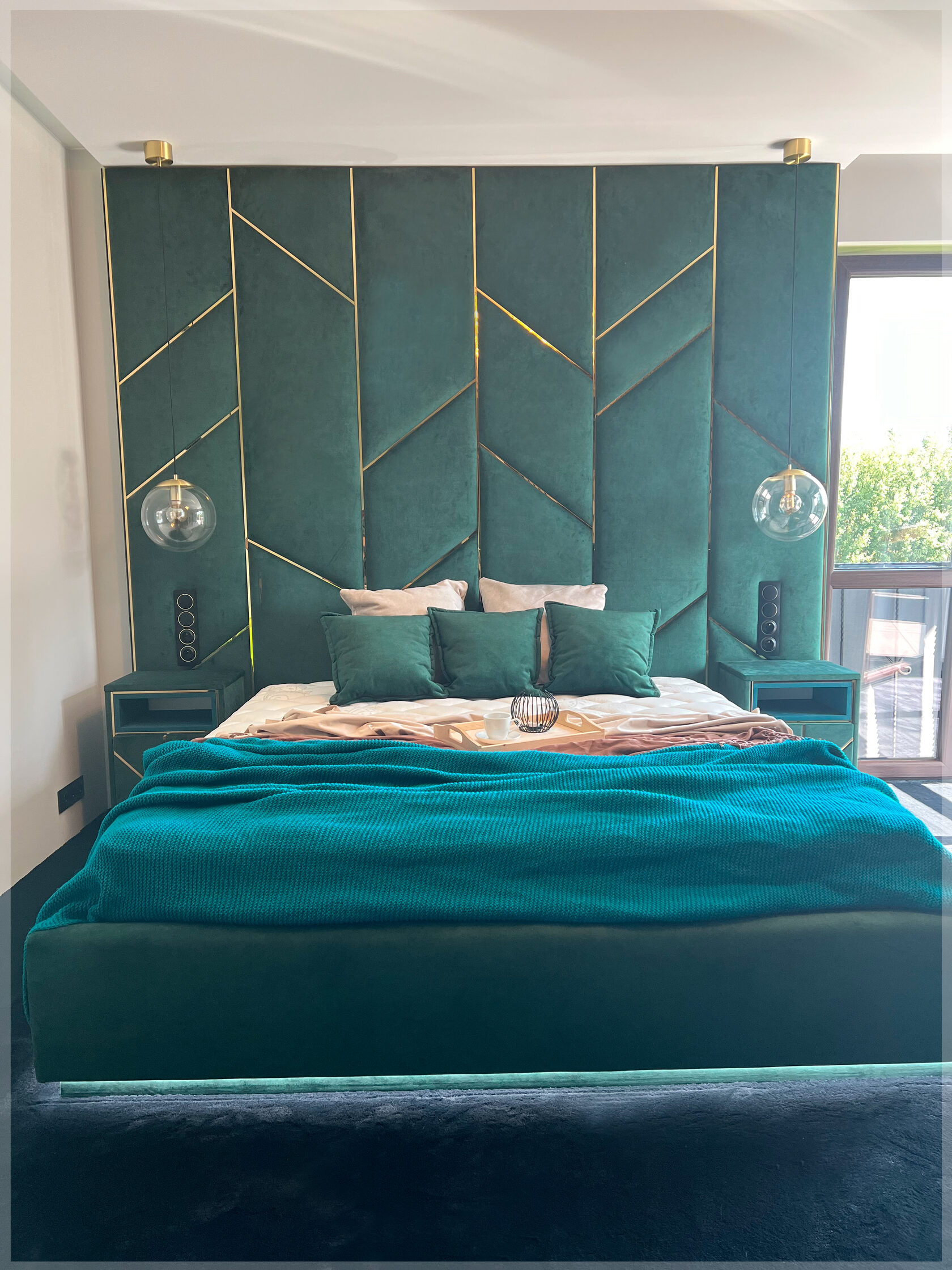 Ściana tapicerowana Rio z łózkiem + ledy w ramie łóżka. Głównym celem tego projektu jest rewelacyjnie wysoki, solidnie wyściełany zagłówek z metalowymi złotymi listwami. Ta ściana tapicerowana prezentuje współczesny styl z błyszczącym wykończeniem. To piękne łóżko ma cudownie podświetlane, błyszczące wykończenie, dzięki któremu Twoja sypialnia wygląda na jasną i przestronną. Wprowadź nowoczesną elegancję do swojej głównej sypialni dzięki wysokiemu, pikowanemu, teksturowanemu zagłówkowi. Oświetlenie wbudowane w podstawę nadaje mu majestatycznego efektu.