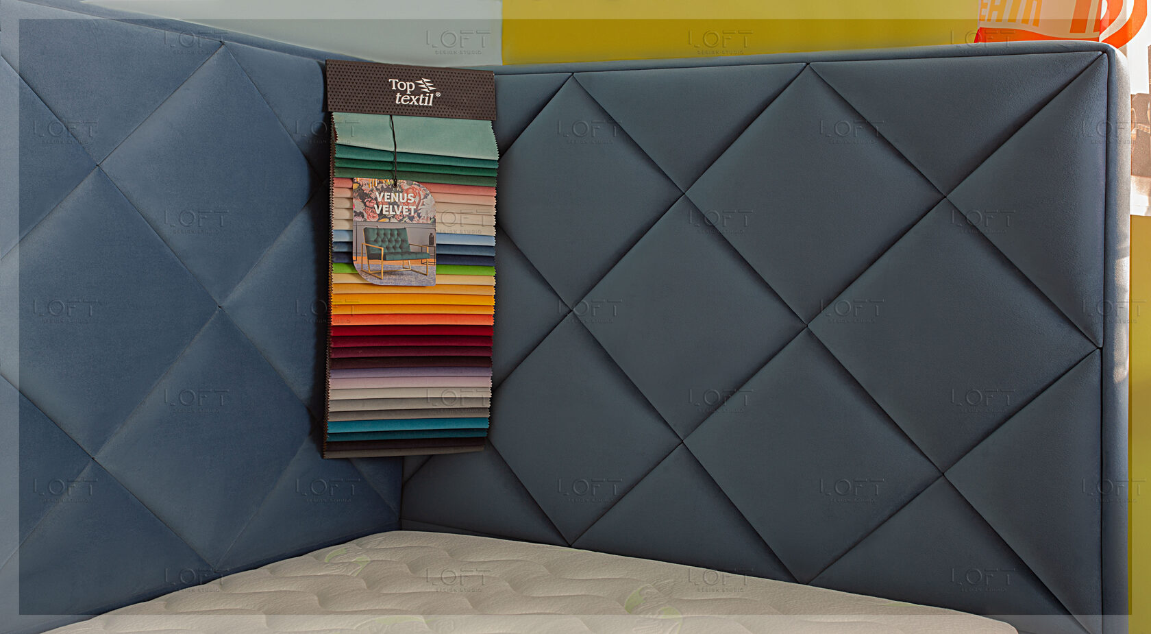 - z zagłówkiem standardowym albo ze ścianą tapicerowaną na wysokość lub szerokość pokoju