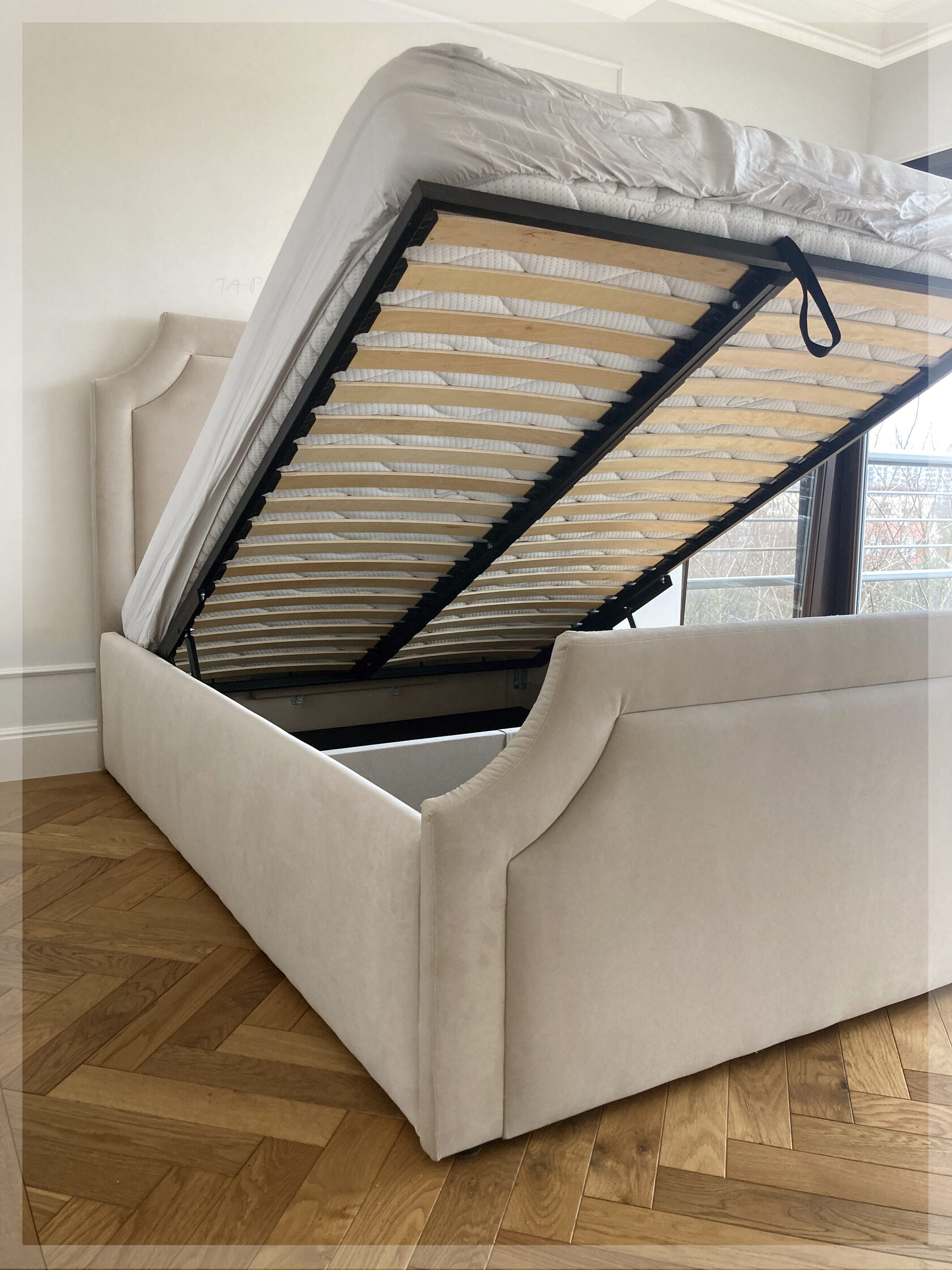 Model Toronto to nowy wymiar wygody i elegancji. Proste tapicerowane wezglowie z jednym dużym kasetonem w obudowie oraz deska frontowa w ksztalcie zagłówka dodają łóżku prosty elegancki styl. Ponadto łóżko posiada pojemnik na pościel oraz stelaż otwierany na ramie metalowej + siłowniki gazowe.